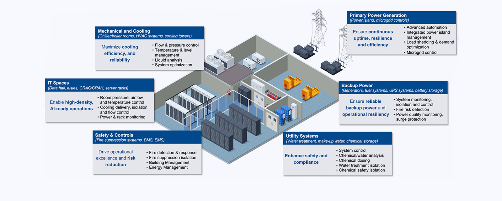 Applied Control supports owners, EPCs, and contractors by integrating MEP infrastructure, cooling systems, automation platforms, and Building Management Systems (BMS) across data center facilities.
